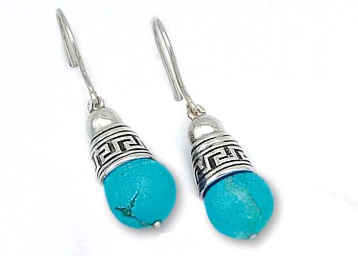 Exquisite platinum plated drop-style earrings with a distinct Greek-inspired design. Each earring features a vibrant turquoise-colored teardrop stone with natural veining, adding texture and character. The stones are capped with a silver band adorned with a Greek key pattern, which complements the classic aesthetic. The silver hook attachments provide a secure and comfortable fit while allowing the earrings to dangle elegantly. The combination of the turquoise stone and Greek key pattern gives these earrings a striking, Mediterranean-inspired look.