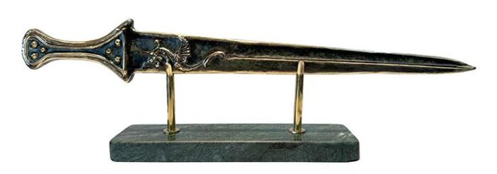 The sword is offered with a marble stand to create a perfect display piece. Handmade in Greece of solid bronze, an exact museum reproduction.