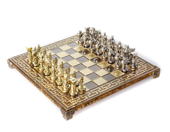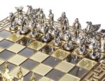 This chess set features a brown bronze chessboard and gold & silver Spartan Warriors pieces including: