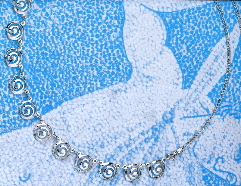 A stunning necklace crafted from polished, high-quality 925o sterling silver, exuding an elegant sheen. The spiral design is inspired by the classic Greek key pattern, a continuous geometric motif symbolizing infinity and unity. This intricate pattern gracefully loops along the length of the necklace, each segment meticulously shaped into the iconic meandering lines that give a sense of rhythm and harmony.