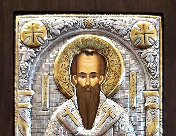 An exquisite silver Greek Orthodox icon of the St. Basil the Great.