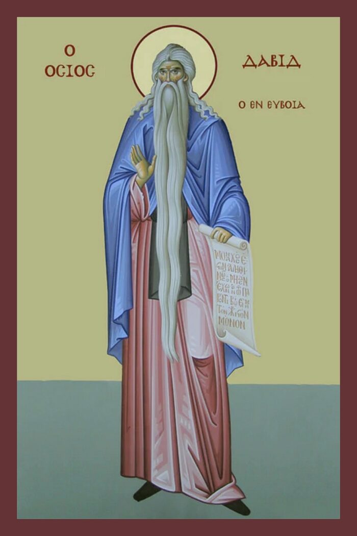 St. David was born around 1500 AD in Lokrida, opposite from the island of Evia in Greece. He is famous for founding the Monastery of Saint David, which is dedicated to the Transfiguration of the Savior, in about 1535-1540 AD and where he lived his monastic life there in the 16th century. His relics, his censer, his priestly stole, and other treasures are within the church of the Monastery.