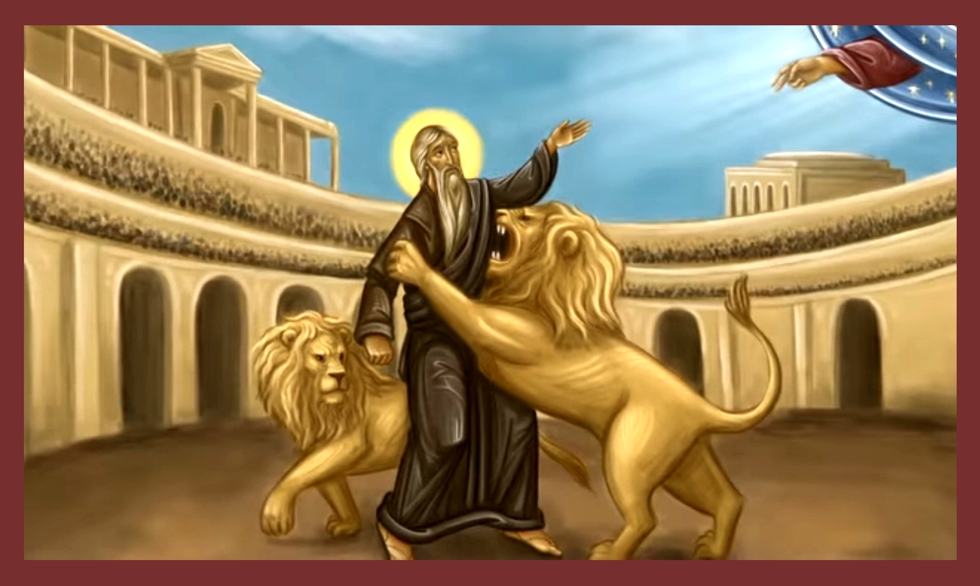 A beautiful Greek Orthodox icon of the Martyrdom of St. Ignatius, handmade & hand painted by an expert Greek hagiographer.