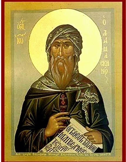 St. John of Damascus was also known as John Damascene, Chrysorrhoas, “streaming with gold,” (i.e., the golden speaker). He was born and raised in Damascus, in all probability at the Monastery of Saint Sabbas (Mar Saba), southeast of Jerusalem. His feast day is December 4..