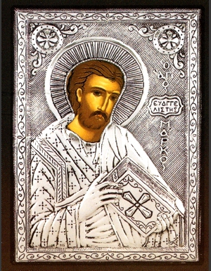 An exquisite silver Greek Orthodox icon of the Apostle, St. Mark the Evangelist.