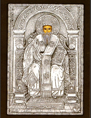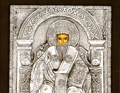 An exquisite silver Greek Orthodox icon of St.Spyridon. St. Spyridon was a fourth century bishop who was present at the First Ecumenical Council. He is also commonly referred to in Corfu as Keeper of the City, since he is also the patron saint of that island (this is where his relics are located and venerated).