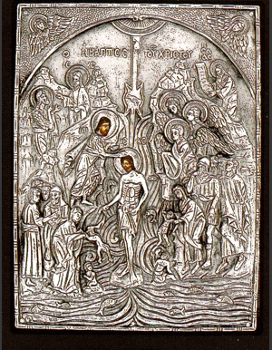 An exquisite silver Greek Orthodox icon of the Baptism of Jesus Christ by St. John the Baptist.