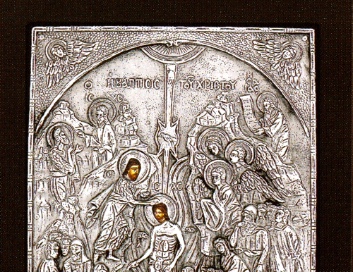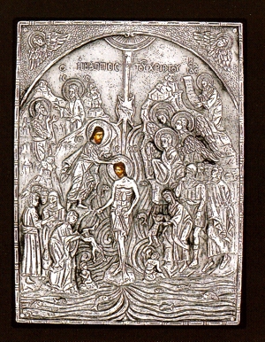 An exquisite silver Greek Orthodox icon of the Baptism of Jesus Christ by St. John the Baptist.