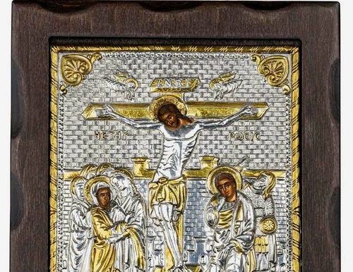 An exquisite silver & gold Greek Orthodox icon of the Crucifixion.