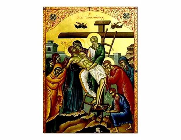 A beautiful Greek Orthodox icon of Christ’s Descent from the Cross, handmade & hand painted by an expert Greek hagiographer.