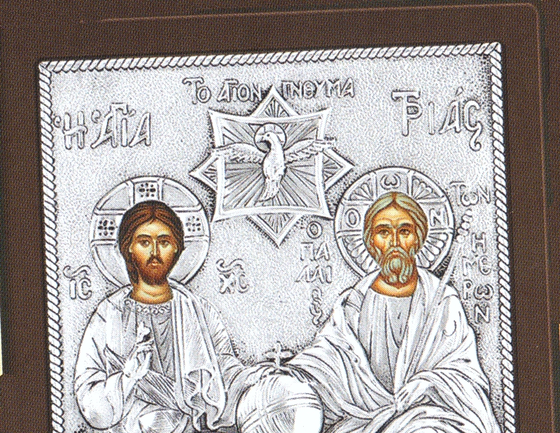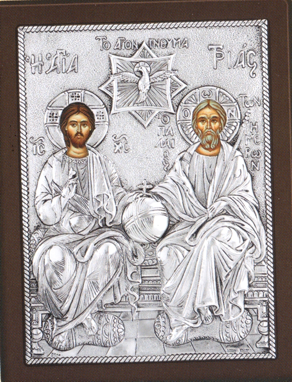 An exquisite silver Greek Orthodox icon of the Holy Trinity, Father, Son and the Holy Spirit.