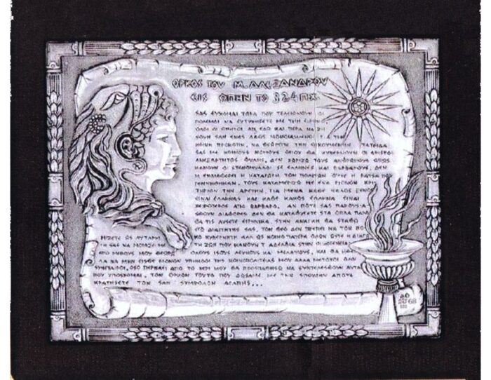 “It is my wish, now that wars are coming to an end, that you should all be happy in peace. From now on, let all mortals live as one people, in fellowship, for the good of all. See the whole world as your homeland, with laws common to all, where the best will govern regardless of their race. Unlike the narrow-minded, I make no distinction between Greeks and barbarians. The origin of citizens, or the race into which they were born, is of no concern to me. I have only one criterion by which to distinguish them: virtue.“For me, any good foreigner is a Greek and any bad Greek is worse than a barbarian. If disputes ever occur among you, you will not resort to weapons but will solve them in peace. If need be, I shall arbitrate between you. See god not as an autocratic despot, but as the common father of all and thus your conduct will be like the lives of brothers within the same family. I, on my part, see you all as equal, whether you are white or dark-skinned. and I should like you not simply to be subjects of my commonwealth, but members of it, partners of it.“To the best of my ability, I shall strive to do what I have promised.“Keep as a symbol of love this oath which we have taken tonight.” “