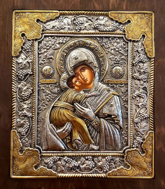 An exquisite silver & gold Greek Orthodox icon of Theotokos Glykophilousa depicting the Virgin Mary caressing her son, so that they appear to be kissing.