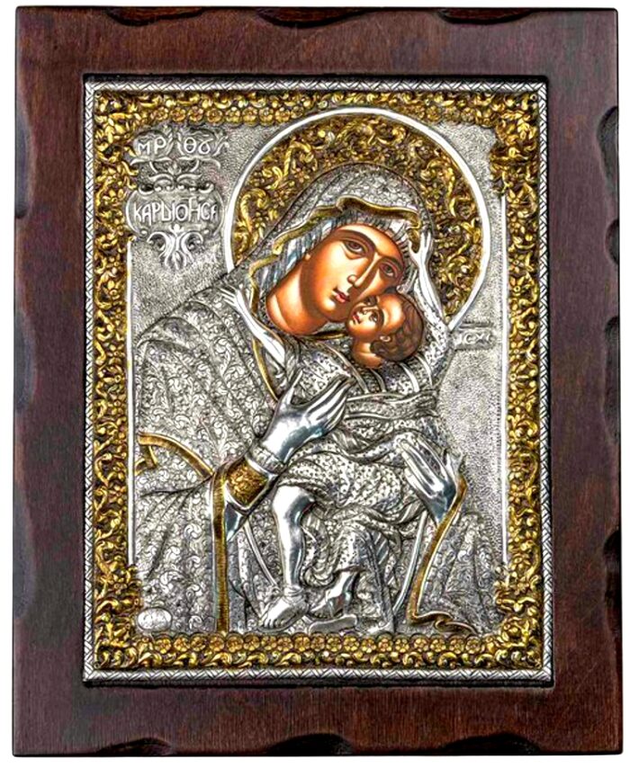 An exquisite silver & gold Greek Orthodox icon of Theotokos Kardiotissa.