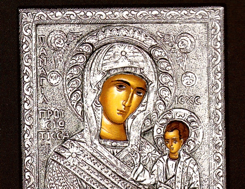 An exquisite silver Greek Orthodox icon of Virgin Mary Prousiotissa. The Holy Icon Panagia of Prousiotissa according to tradition was painted by the hand of St. Luke the Evangelist.