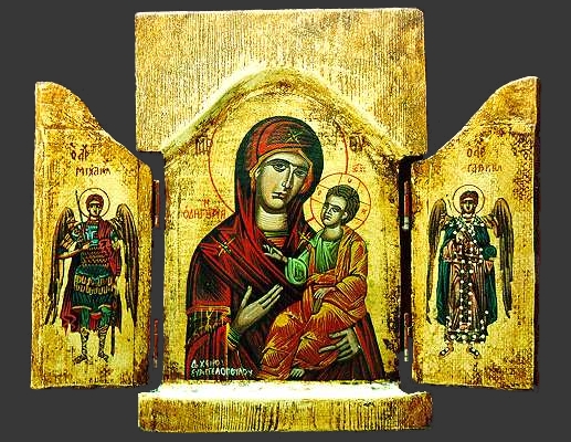 An exquisite Greek Orthodox triptych icon depicting Theotokos Odigitria (She who guides) & the Archangels St. Michael and St. Gabriel, handmade & handpainted by an expert Greek hagiographer.