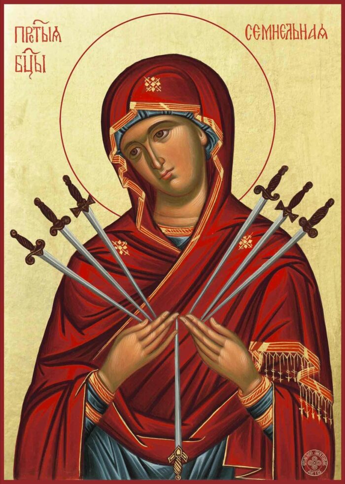 This beautiful icon relates to the prophecy of Saint Simeon the Theodochus, recorded by the Evangelist Luke: “…and the pain, go through your heart, as a stabbing sword…” (Luke. 2.35). These words refer to the pain that Virgin Mary would have experienced at the time of her separation from her beloved Son when he was crucified in front of her eyes.